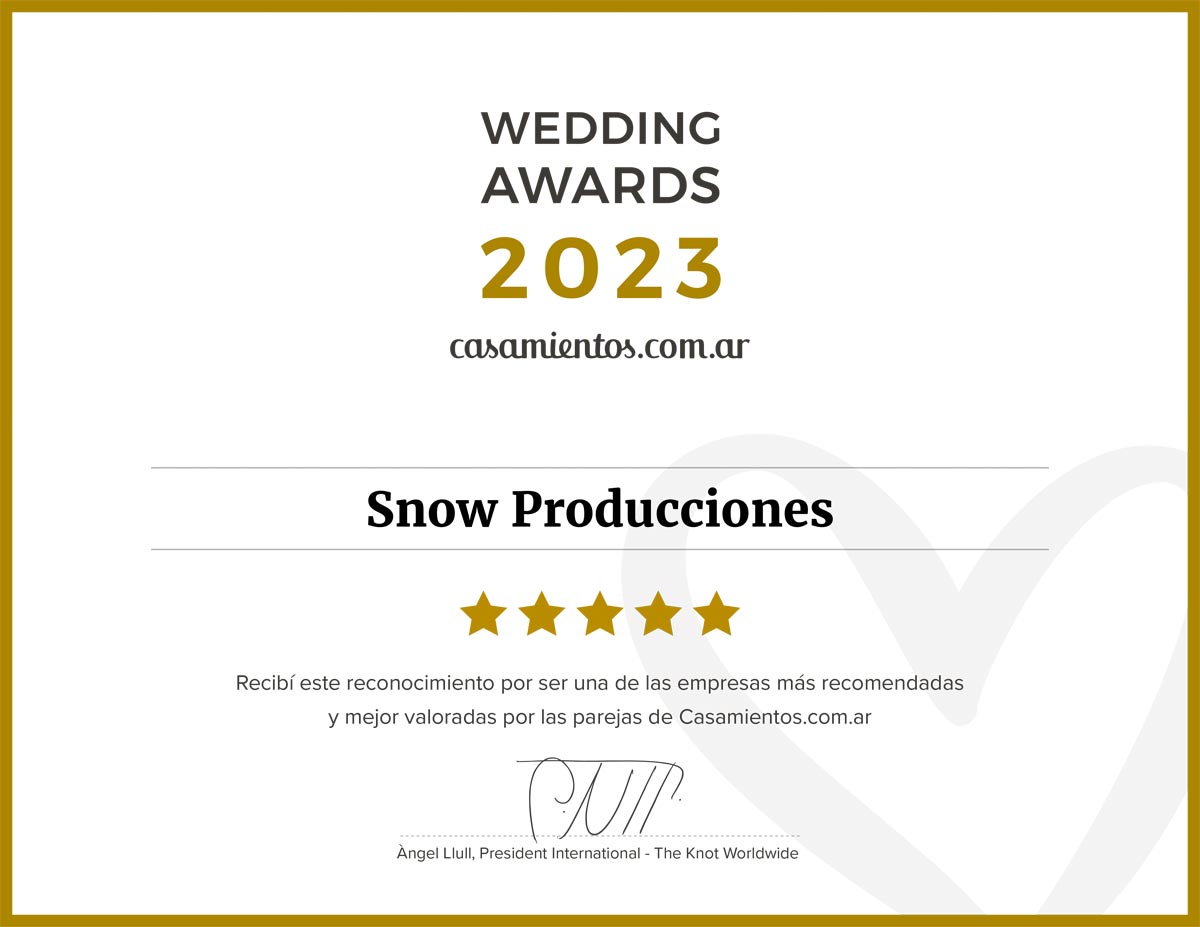 Los Wedding Awards galardonaron a las empresas mejor valoradas por las parejas que se casaron en el 2022 de entre un total de más de 10.000 empresas en las diferentes categorías, teniendo también en consideración la calidad y profesionalidad del servicio que ofrecen. Snow Producciones acumula un total de 22 opiniones en la web de referencia, que le hicieron alzarse con el premio. Por ello, el papel más importante lo tienen las parejas que, con sus opiniones y tras haber disfrutado de los servicios de los profesionales en sus casamientos, definen quiénes serán los ganadores. Precisamente por este motivo este galardón no es uno más del sector, sino el más valorado, por un lado por los profesionales, que lo sienten como un reconocimiento a su trabajo bien hecho, y por otro por las parejas, al considerarlo una garantía de que están frente a un experto del sector.